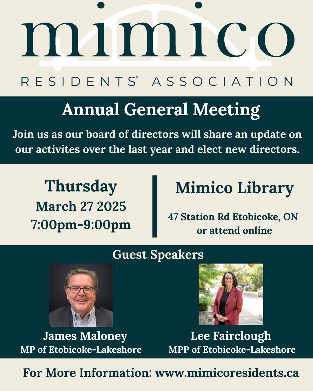 View this email in your browser Join us tomorrow for our Annual General Meeting at the Mimico Centennial Library. Hear from our board of directors about our activities over the last year, Mimico priorities and more. We are pleased to be joined by MP James Maloney and MPP Lee Fairclough who will address the Mimico community and answer questions from attendees. Register for the MRA 2025 AGM here📅 When: Thursday, March 27th, 7:00 PM – 9:00 PM📍 Where: Mimico Centennial Library, 47 Station Rd (enter from the back) & online via Zoom JOIN TODAYMAKE A DONATIONWorking together for a beautiful, vibrant, and safe community.info@mimicoresidents.camimicoresidents.caWant to change how you receive these emails? You can update your preferences or unsubscribe |