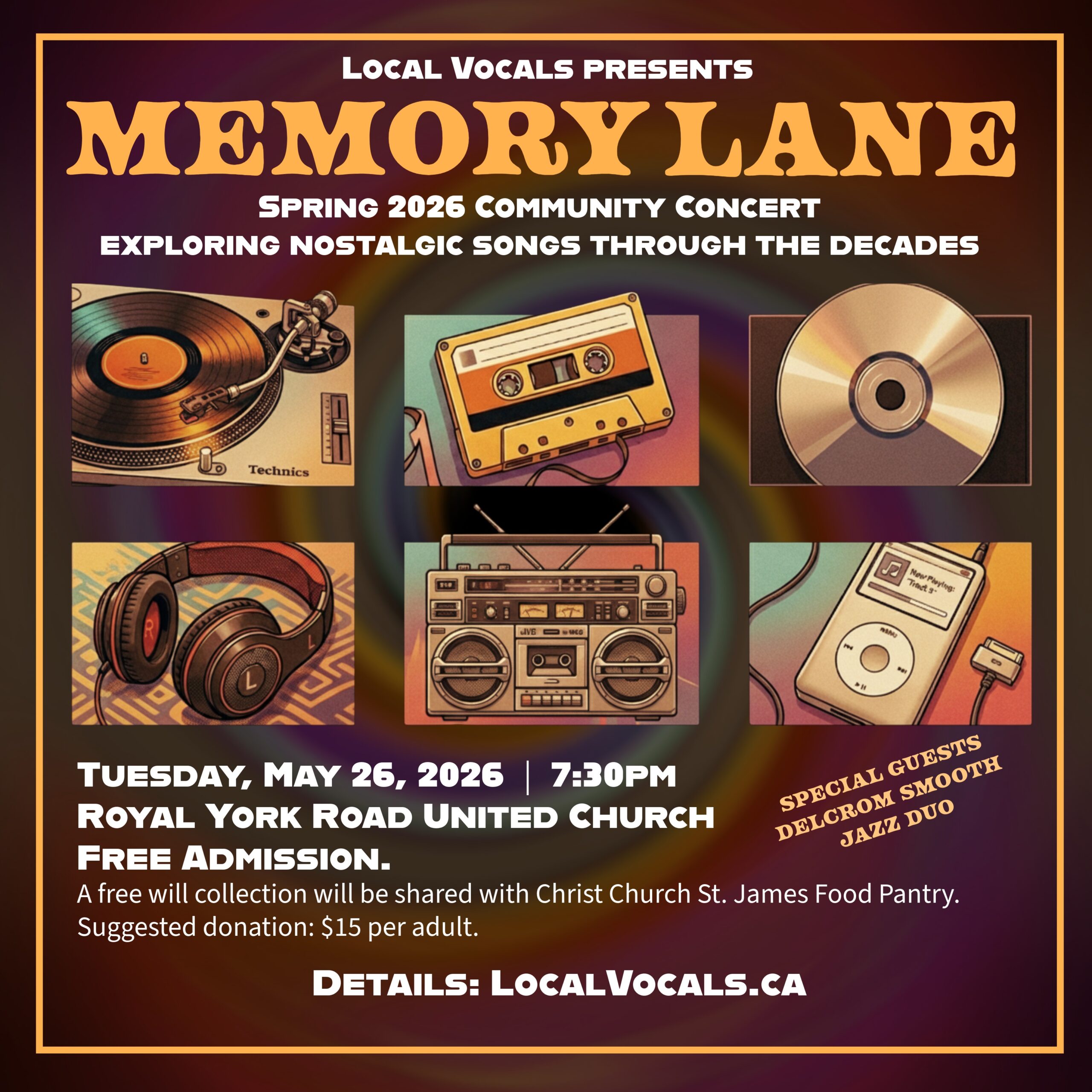 Featuring Local Vocals Community Choir, solo performers, and special guests Del Crom Smooth Jazz Duo in a program of nostalgic songs through the decades.