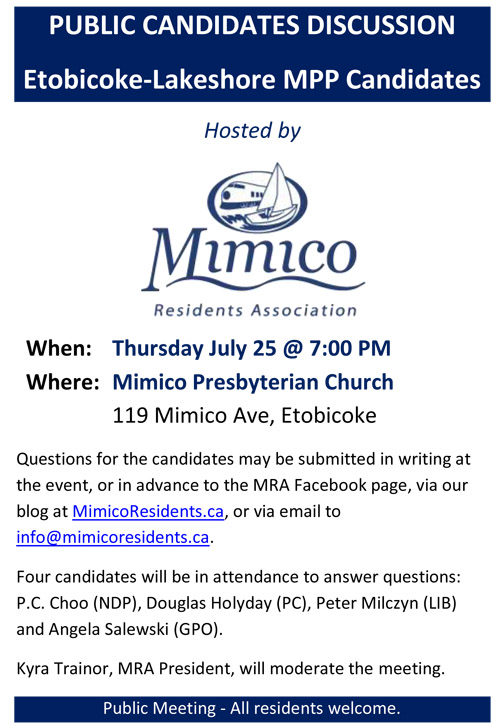 PUBLIC CANDIDATES DISCUSSION Etobicoke-Lakeshore MPP Candidates Hosted by Mimico Residents Association When: Thursday July 25 @ 7:00 PM Where: Mimico Presbyterian Church, 119 Mimico Ave, Etobicoke Public Meeting – All residents welcome. Share this event on Facebook. For Immediate Release:… Read More »MRA hosts ETOBICOKE-LAKESHORE MPP Candidates Discussion Thursday, July 25